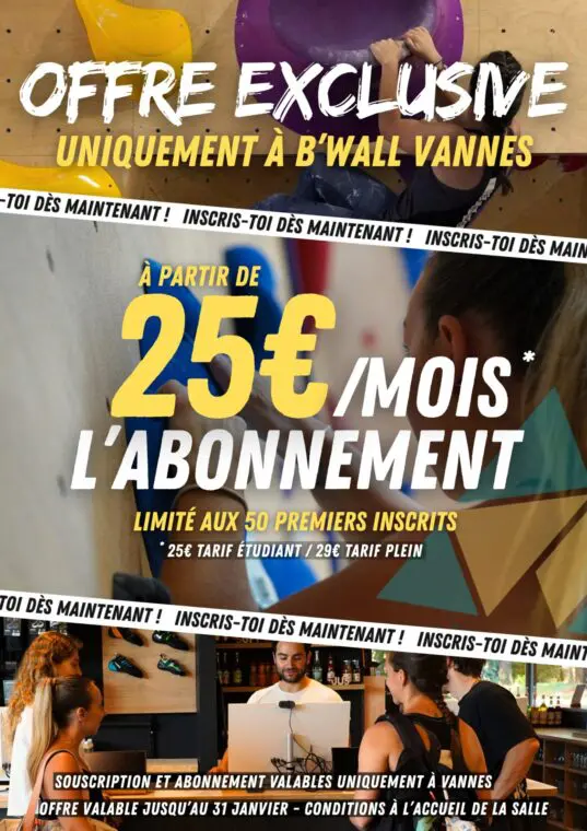 Mon petit doigt me dit qu’une très belle surprise vous attend chez B’wall Vannes… Jusqu’au 31 janvier, les 50 premiers abonnements annuels sont disponibles à partir de 25€ par mois : l’offre idéale pour grimper à prix réduit toute l’année !